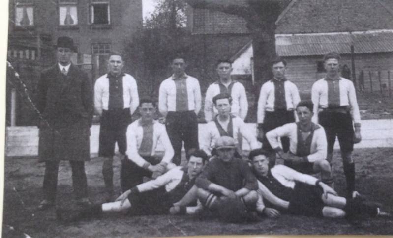 Op foto boven ziet u enkele jongelui uit de jaren 1915-1925 met voetbalschoenen van die tijd om hun nek, op weg naar een wedstrijd (je).